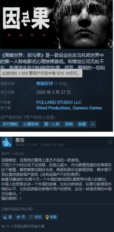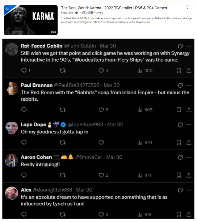 王勇赫还很兴奋地说了一大段话:“游戏在Steam德国区的所有评论百分百好评,还有一名德国玩家向他们写了封信,表示很高兴看到这款游戏;《双峰》社区、11 bit、Remedy也转发了对《Karma》的祝贺;神奇的是,《纽约时报》推荐了我们的游戏;海外日韩及其它地区主播也边落泪,边和本地玩家直播。”