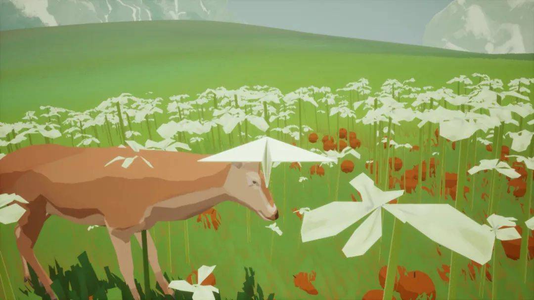而行至后期,当丹尼尔开始审视自我后,情绪变得像纸飞机一样轻盈,主角也来到了一片草地。这或许是游戏里最温馨开阔的场景。纸飞机触碰小鹿,会在身上弹跳了一下,树下堆满了苹果。