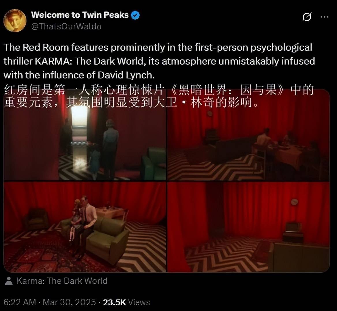 《双峰》则是《黑暗世界》在视觉层面学习的作品,也是他们个人喜好的体现。王勇赫说,“《双峰》作为三十年前大卫·林奇拍摄的作品,影响了《心灵杀手》《锈湖》等众多游戏,拥有庞大的社群玩家”,同样作为社群玩家的他们,希望《黑暗世界》也能吸引这群玩家。