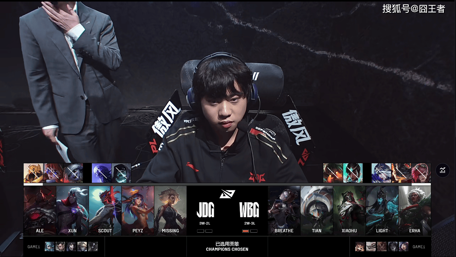 第一局比赛,JDG蓝色方,禁用韦鲁斯、赛恩、杰斯、女枪、泰坦,选用格温、赵信、狐狸、伊泽瑞尔、牛头;WBG红色方,禁用蔚、兰博、永恩、卡莉斯塔、霞,选用纳尔、纳亚菲利、岩雀、卡莎、妮蔻
