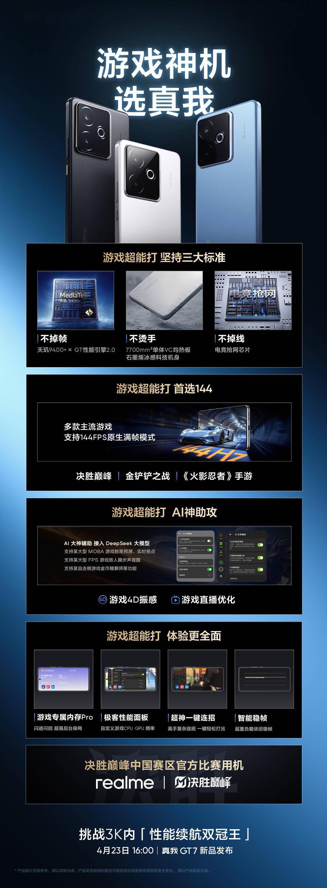 realme真我品牌即将迎来又一力作,真我GT7新机的发布会定于4月23日下午4点盛大开启。这款备受瞩目的新机将作为首批搭载联发科天玑9400+旗舰芯片的设备亮相,并且引入了全新的GT性能引擎2.0,该技术以芯片级内核为核心,承诺为玩家带来“无限稳帧”的游戏体验,不受游戏类型限制。