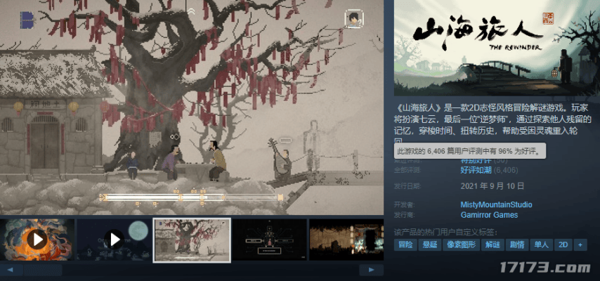 本次过审的版号中,还有一款非常经典的国风2D妖怪类冒险解谜游戏《山海旅人》,这款游戏在2021年登陆Steam的时候,就因独特的风格和优秀的故事引来了不少关注,目前在Steam上拥有96%的好评如潮,是非常经典的国风独立游戏。