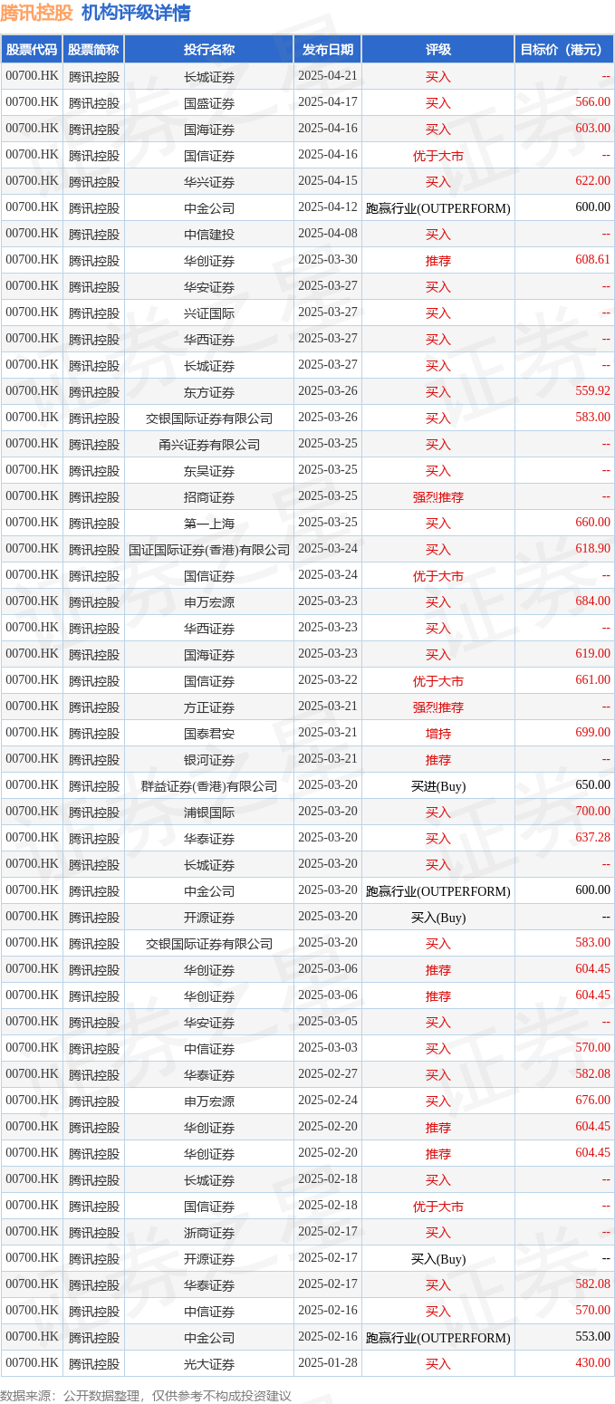 投行对该股的评级以买入为主,近90天内共有31家投行给出买入评级,近90天的目标均价为608.13港元。长城证券最新一份研报给予腾讯控股买入评级。