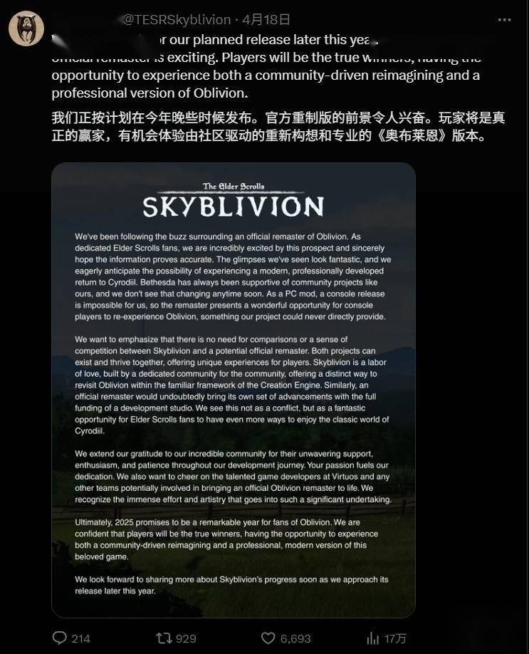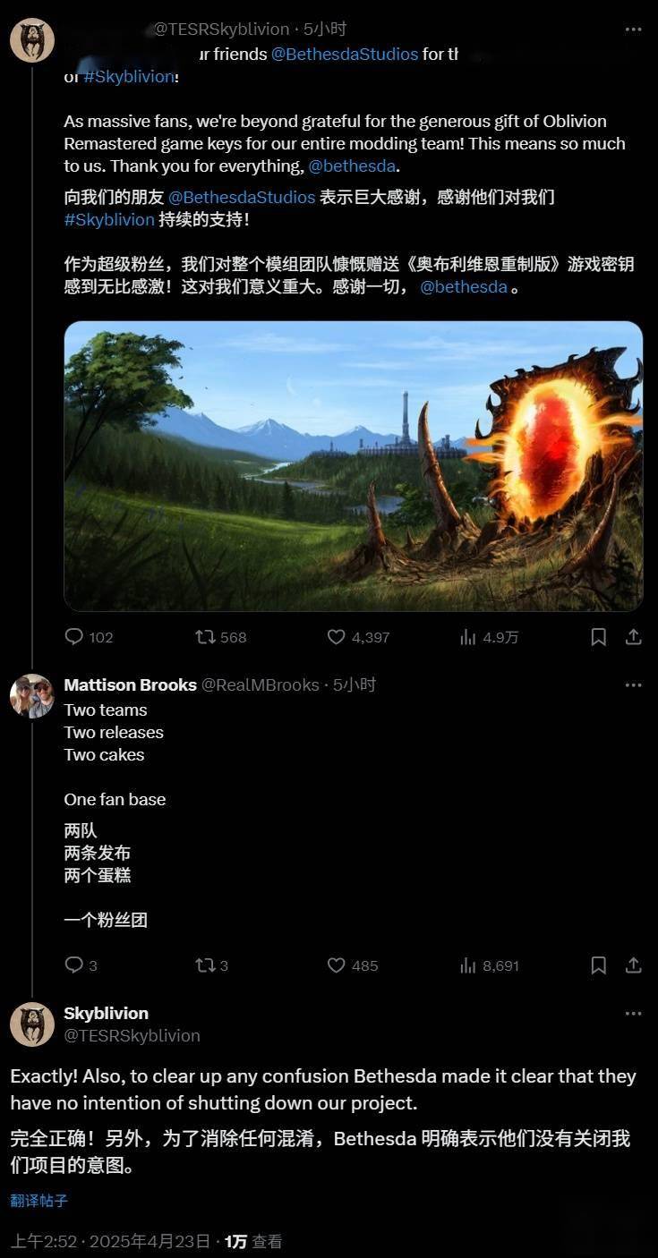 官方下场重制后,Skyblivion 今日发布声明称,B 社明确表示他们没有关闭民间项目的意图,甚至向整个 MOD 团队慷慨赠送了《上古卷轴4:湮灭 重制版》的游戏密钥。