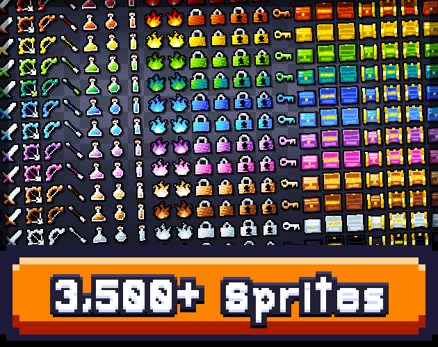 7. 3500+像素图标资产包,包含硬币、药水等多种游戏常见图标,每种图标有最多 14 种配色、5 种轮廓线选择,可用于个人和商业作品。该资产包定价 2.5 美元,购买后可获得后续的免费更新。