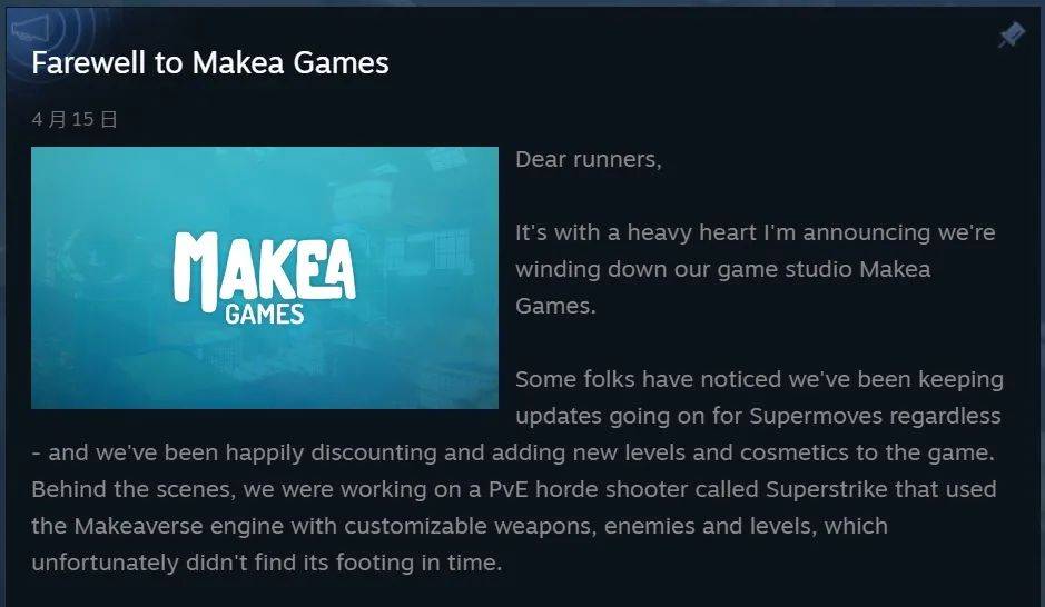 4 月 15 日,2022 年成立,总部位于芬兰坦佩雷的 Makea Games 宣布关闭。公司创始人 Tomi Toikka 在 Steam 页面发布了一则声明,将这一决定归因于“全球经济影响”,其对公司造成了“极为严重”的打击。