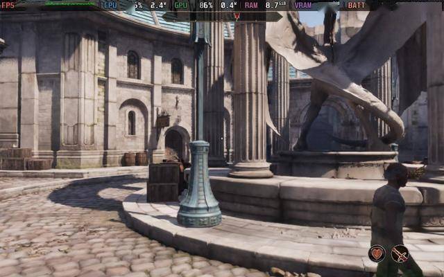 在下水道、洞穴等封闭场景中,稳定30帧毫无压力,实测运行功耗始终低于18W。默认画质下的洞穴光照效果依然出色,城镇区域同样流畅,在帝都跑图时基本保持30帧,仅人群密集处偶有卡顿。