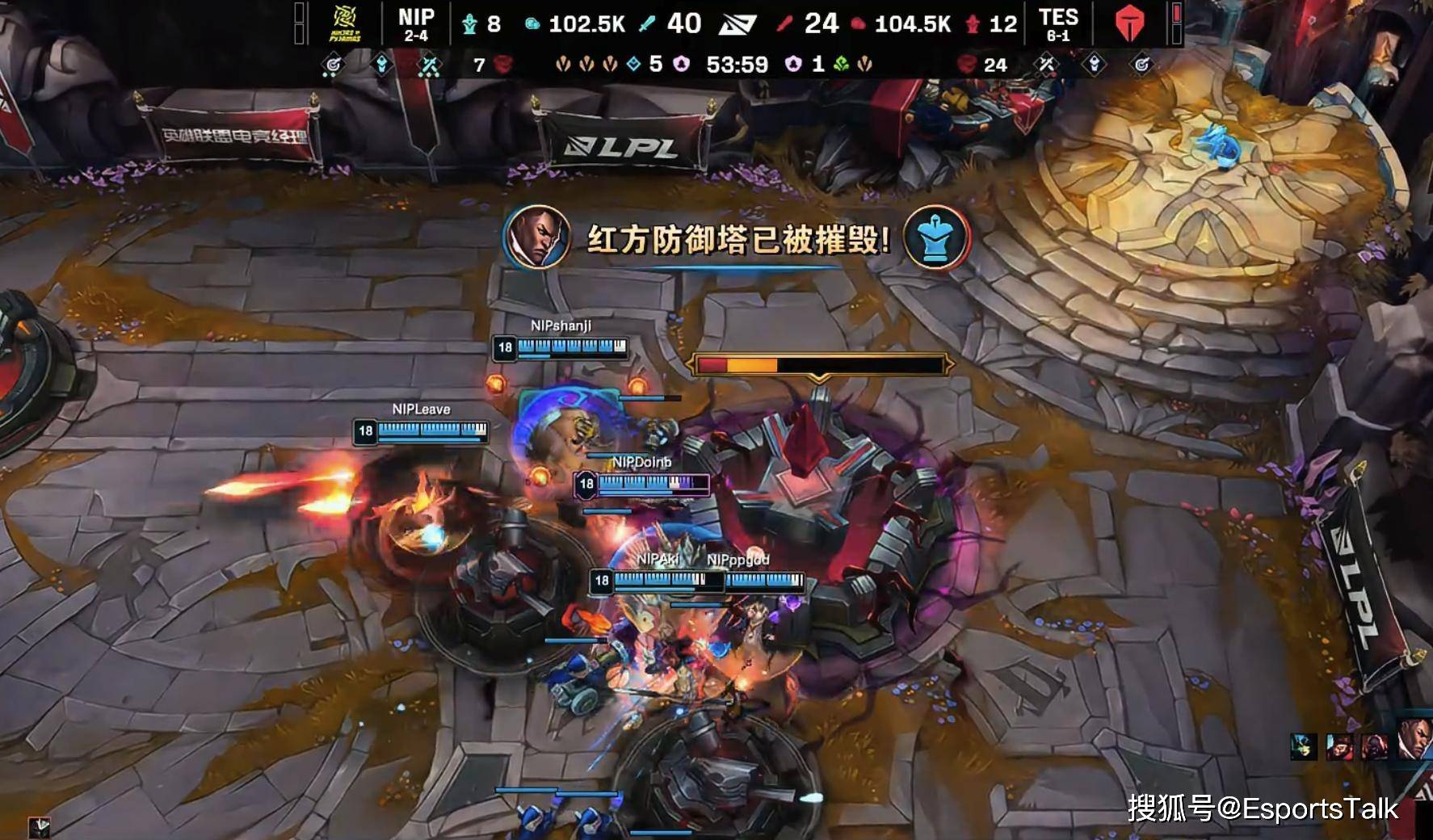 与TES的首场比赛,双方算是打了个有来有回的局,然而左右比赛胜负的,其实是中后期的那波中路团,NIP打野aki将crisp牛头强行拉到人堆,结果被牛头反手顶飞4人,TES众人跟上摧枯拉朽团灭NIP,拿下了首局