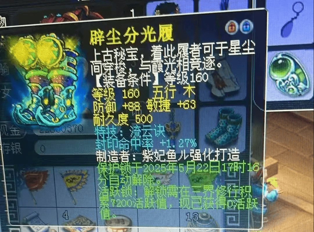 昨天,有玩家在鉴定160级鞋子时,喜提了稀有双蓝字。它具备流云特技并附带封印专属蓝字,封印效果1.27%中规中矩,而流云可为单体队友提升速度,对高端PK抢占一速有着重大的战略意义。