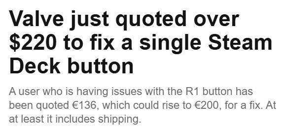 ·这名玩家的Steam Deck近日R1按键坏了,打算问问V社如何修理,不过已经不符合保修条件,于是官方给出了报价,如果按键轻微故障136欧元,重度故障则需要200欧元。