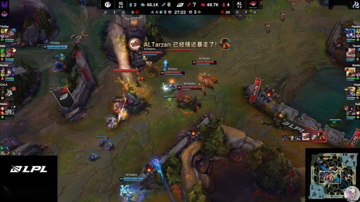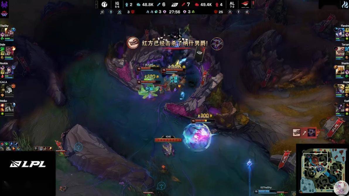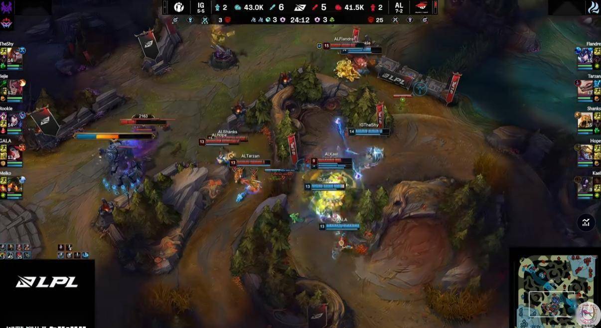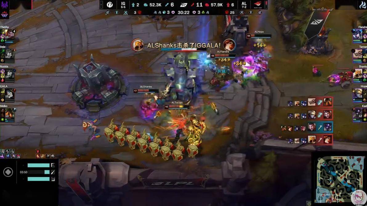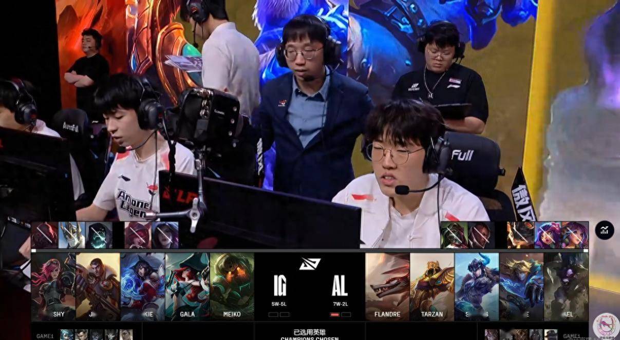 IG优势局为了一条小龙,全员扎堆在龙坑里,中路门户大开,AL在手上有先锋的情况下,IG仍然不选择及时派人回去防守。结果导致AL卡住侧翼的入口,让先锋连破中路三座防御塔,接近2000的经济差被瞬间抹平!IG在这一刻的指挥真的是神人,或许这样一支全神班根本就没有能命令其他人的指挥?