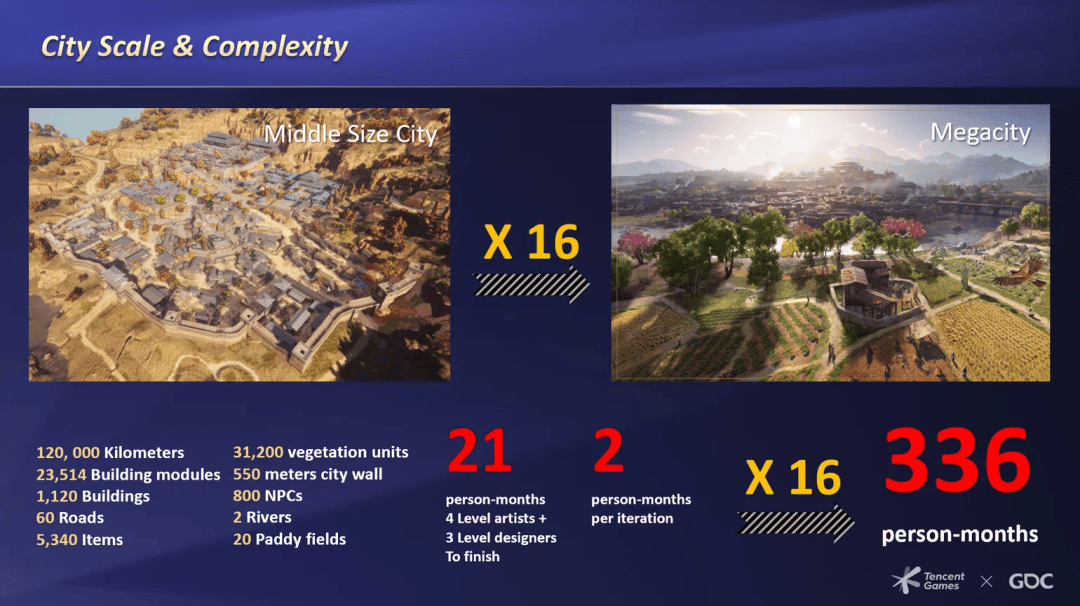 左边的图片是我们之前完成的一座中型城市。我们采用的是人工密集型工作流程完成的,包含约2万栋建筑。我们花了21个人月来构建它,每次迭代需要2个人月。我们想要构建一座像右边图片那样的大都市,其规模是当前城市的16倍。如果采用旧方法,预计需要336个人月,基本上这是不可能完成的任务。那么我们应该怎么做呢?