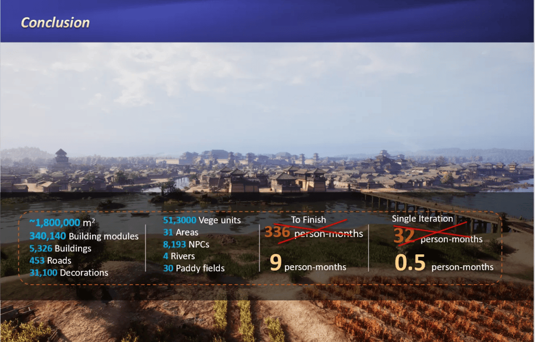 正如我们之前提到的,用手工方法构建这样的城市需要336个人月才能完成,每次迭代需要32个人月。通过使用我们的古代城市工具集,我们将成本降低到9个人月完成,0.5个人月迭代。对于未来,我们认为虚幻PCG框架可以在游戏开发中扮演重要角色。