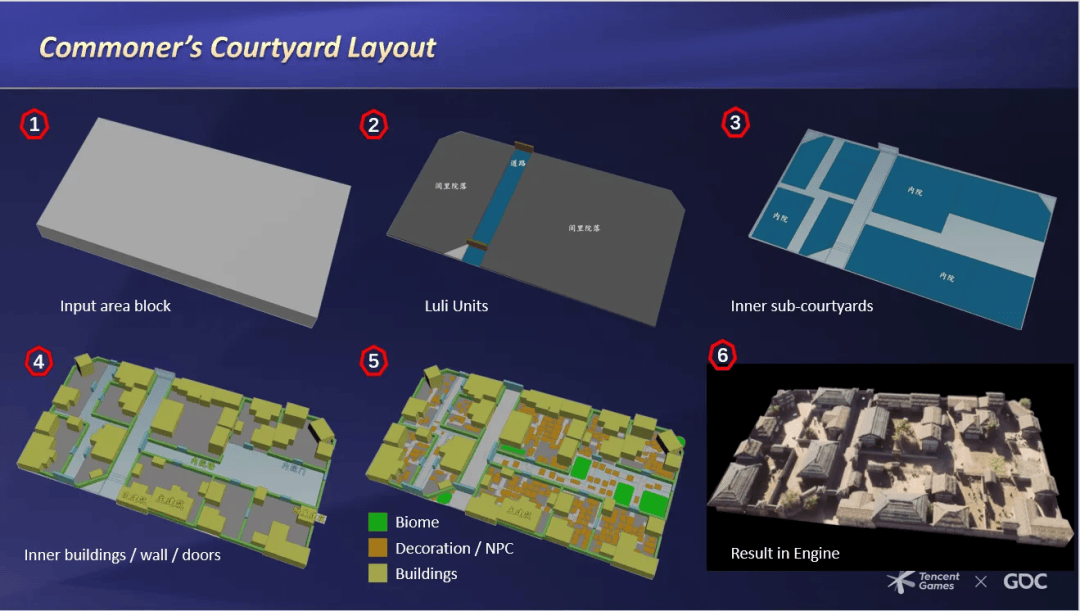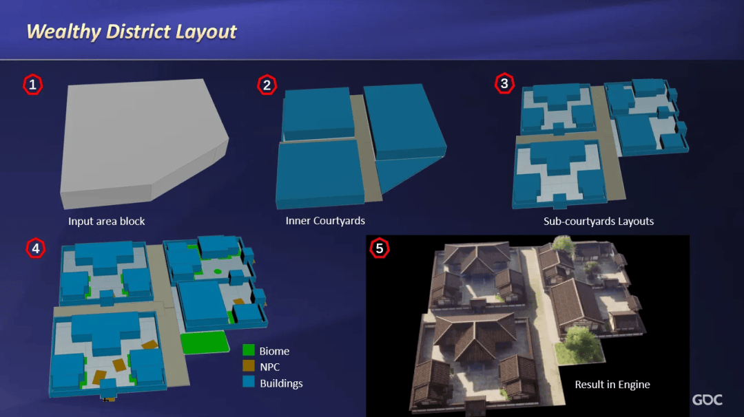 我们将有一个输入区域块,这是艺术家在虚幻引擎中创建的。这个块将被划分为几个闾里单位,一些内部道路数据也会生成。每个闾里单位将在第三步被再次划分为几个小庭院,在第四步根据之前的结果生成建筑物和墙壁,第五步生成更多的装饰性内容,如生物群落区域和NPC。