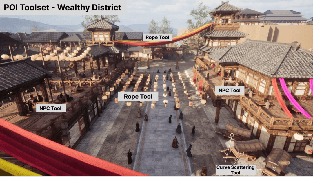 对于POI区域,艺术家可以使用我们的POI工具集快速创建多种元素,如绳索、标志、杂物、城墙或城市外的稻田。
