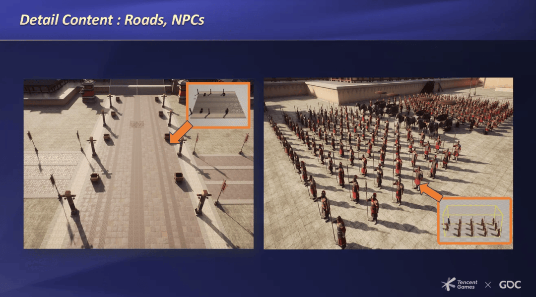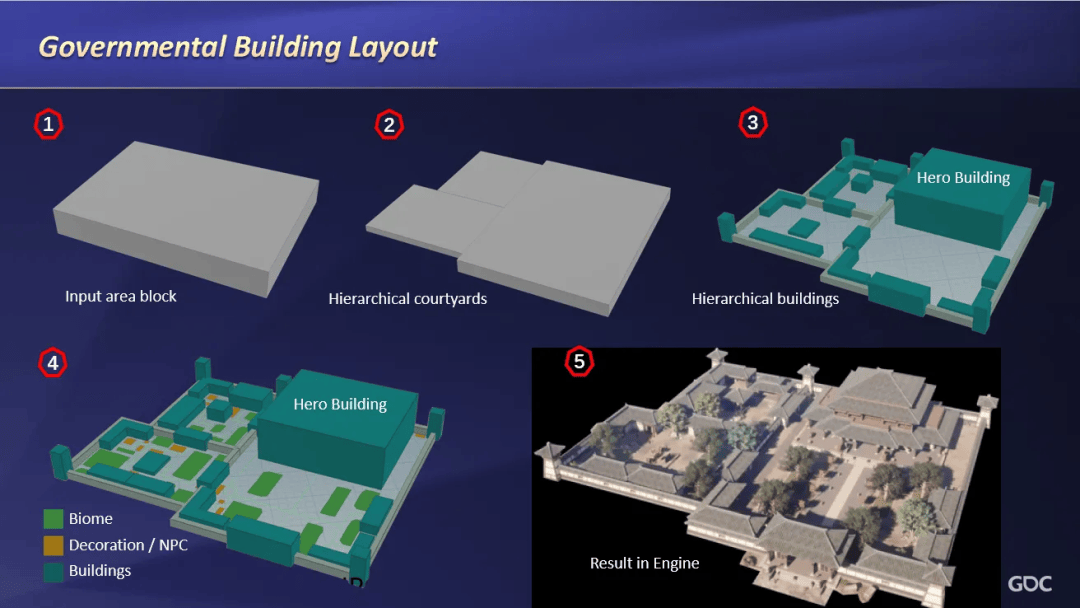 PCG后端将从引擎接收区域数据,并根据我们之前提到的规则,如闾里制,递归且分层地运行计算。以匹配秦朝的风格。并且详细内容,如建筑物、内部道路、NPC和装饰性内容也将在该步骤中生成。
