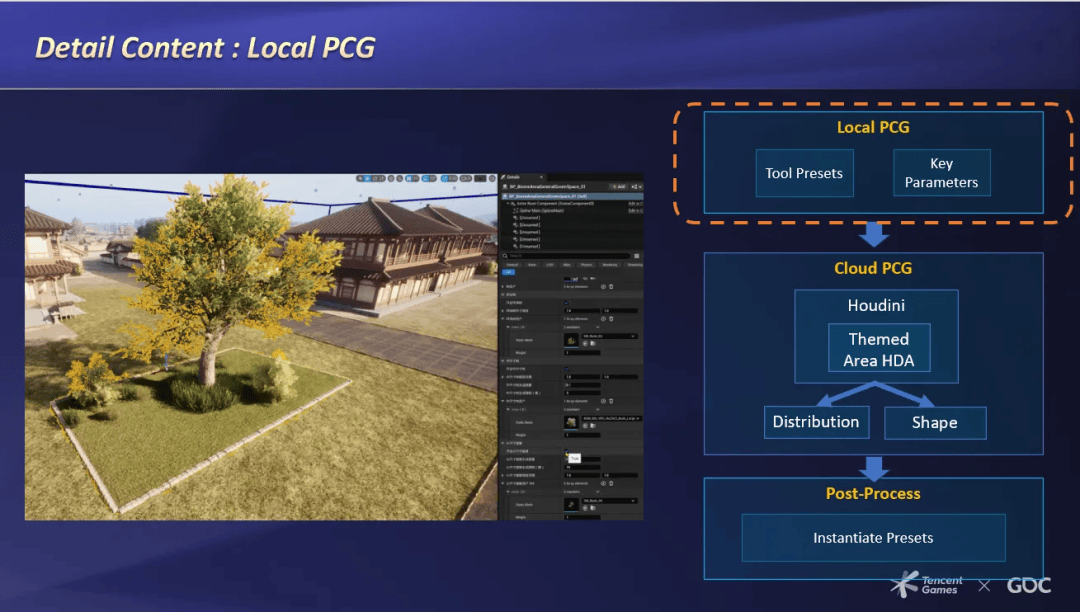 所以我们有一个称为本地PCG的过程。艺术家可以在虚幻引擎中原型化花园预设的外观。就像左边视频显示的那样。艺术家正在使用基于虚幻PCG框架的工具编辑这个预设。