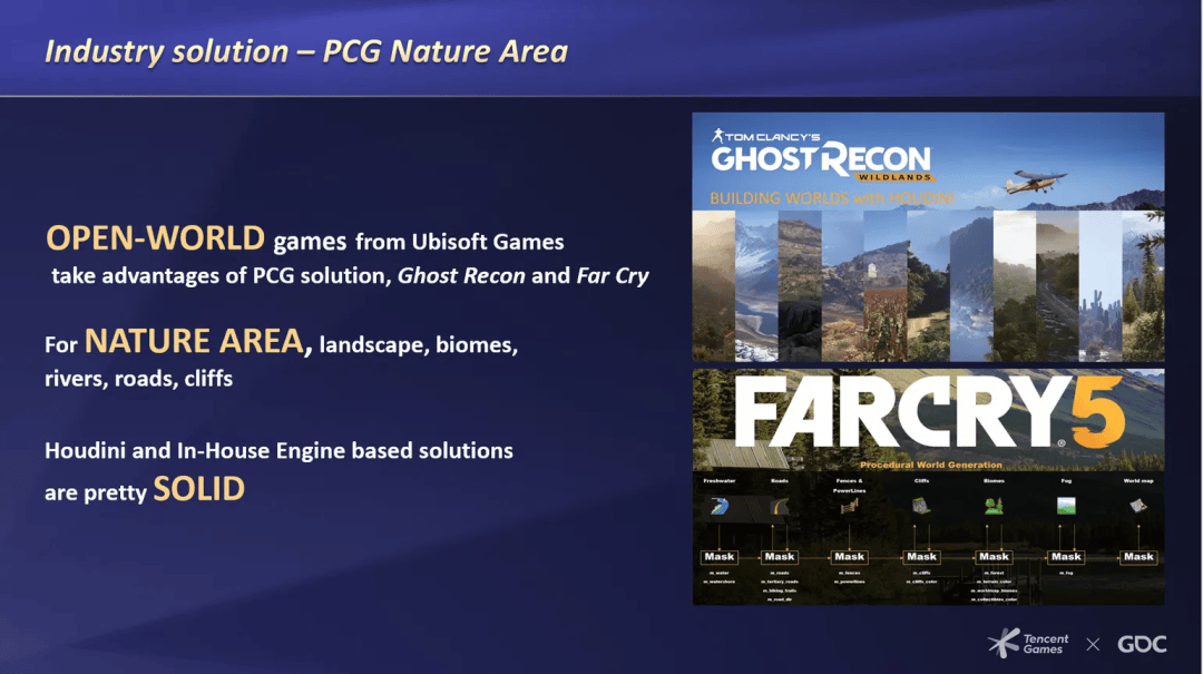 带着这些问题,我们寻找了一些行业解决方案来帮助我们。育碧之前发布了一系列关于程序化生成的演讲,还有几款基于Houdini的解决方案在自然环境方面非常出色。