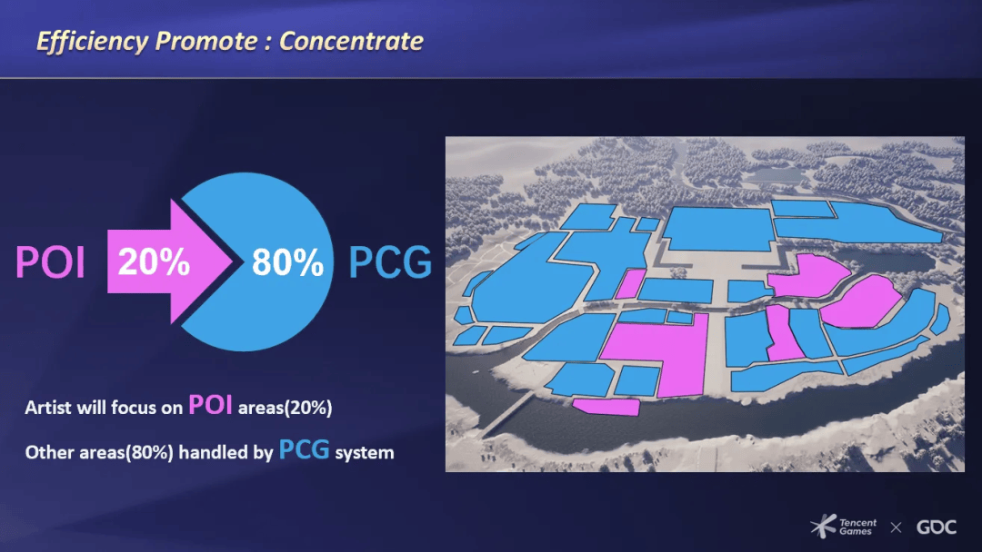 对于我们第三个目标,效率提升部分,我们希望我们的关卡艺术家专注于POI区域,这些区域可能包含大量的游戏玩法设计。