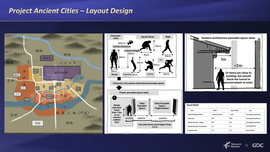 第二个目标是遵循中国古代城市的布局设计。我们需要提供一些工具来帮助他们原型化城市的布局,就像左边图片展示的那样。同时,工具生成的内容也应该符合这些要求。我们对程序化元素的值和位置有一些限制。例如,我们不能有一个太窄的隧道或建筑物和墙壁之间太小的间隙。以符合游戏玩法设计。