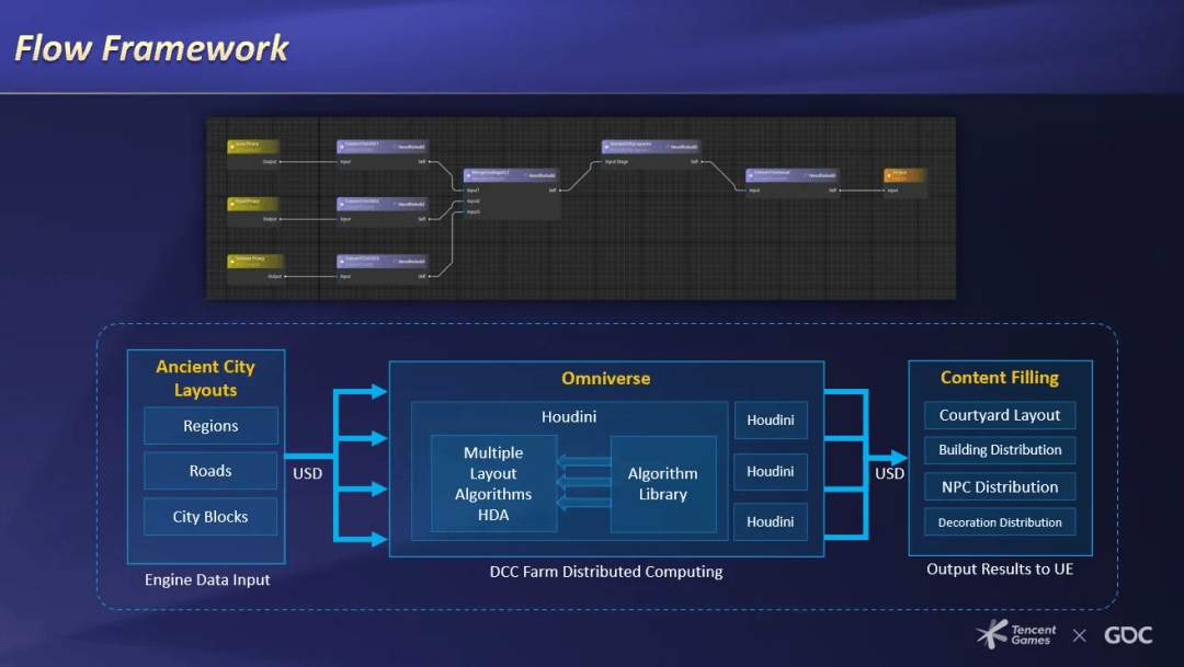 第三,它采用Houdini进行布局算法。Houdini仍然是程序化内容生成最强大的工具,并且它与Flow在云端配合得非常好。