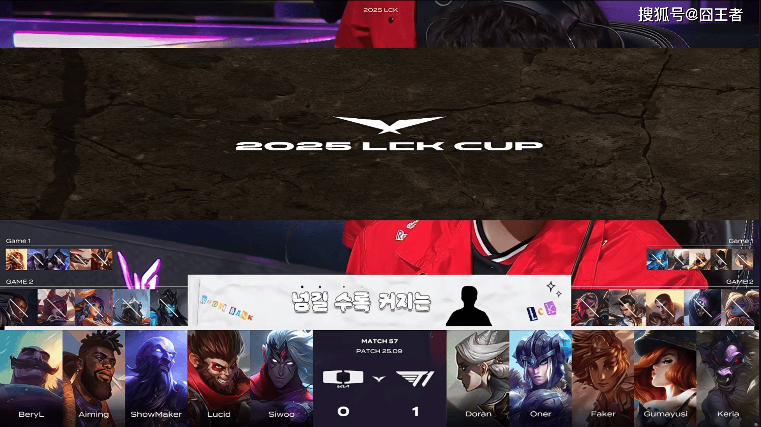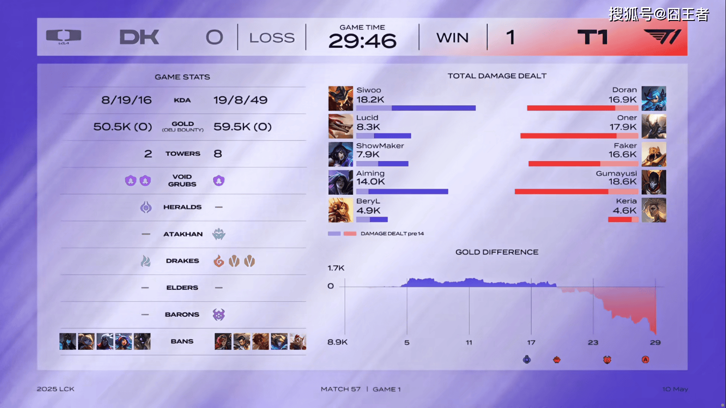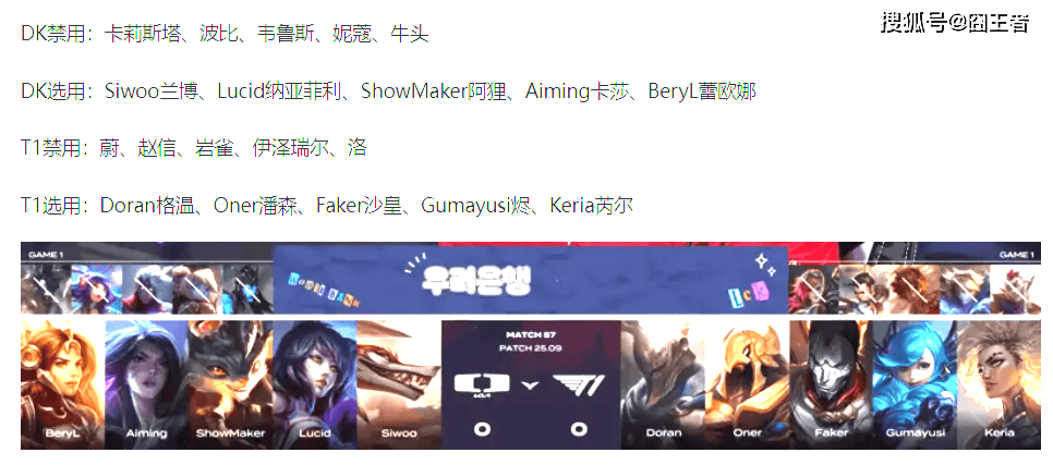 第一局比赛,DK蓝色方,禁用:卡莉斯塔、波比、韦鲁斯、妮蔻、牛头,选用:Siwoo兰博、Lucid纳亚菲利、ShowMaker阿狸、Aiming卡莎、BeryL蕾欧娜;T1红色方,禁用:蔚、赵信、岩雀、伊泽瑞尔、洛,选用:Doran格温、Oner潘森、Faker沙皇、Gumayusi烬、Keria芮尔