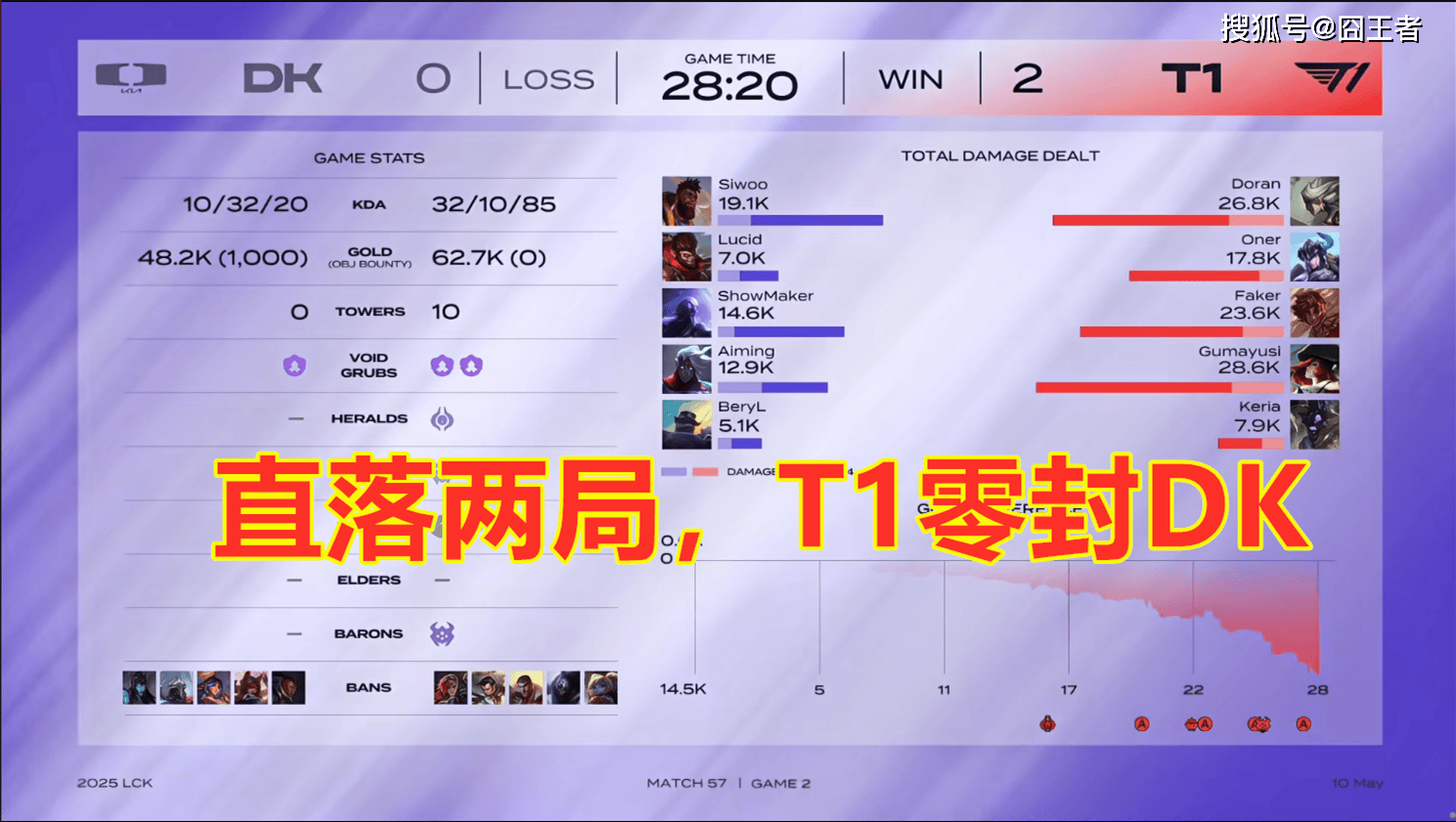 结果第二局比赛,从一开始,就被T1打成了单方面的碾压局啊。比赛第10分钟左右,T1拿下小龙后回身一波打出0换3,此后T1迅速拉开5000经济差;比赛第18分钟左右,DK中路强开Gumayusi女枪,T1迅速反击打出1换3;比赛第20分钟左右,Keria牛头顶起两人配合Gumayusi女枪打出combo,T1一路追击打出2换5团灭DK;比赛第23分钟左右,两队爆发小龙团。T1打出2换5团灭DK;最终比赛第28分20秒,T1大龙团打出1换5再次团灭DK拿下大龙。随后T1依靠大龙Buff团灭DK结束比赛。