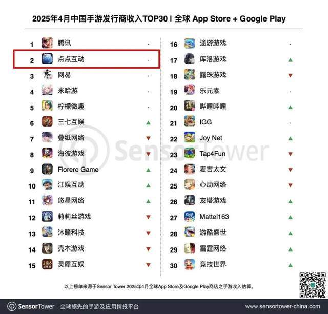 据Sensor Tower的报告显示,2024年12月起,点点互动在移动端的全球收入首次超越网易成为仅次于腾讯的中国游戏厂商第二名,而后网易虽然在今年1月与2月的榜单中重新夺回第二名,但3月又被点点互动再度反超,并在4月蝉联中国手游发行商收入榜亚军。可见,坐拥《无尽冬日》这一“吸金大爆款”的点点互动,目前已经是一家可以与游戏巨头网易掰一掰手腕的移动游戏公司了。