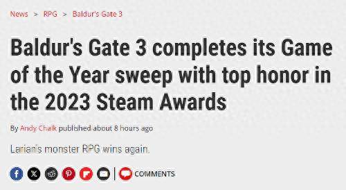 外媒:随着Steam大奖落幕 《博德之门3》拿下三连冠!