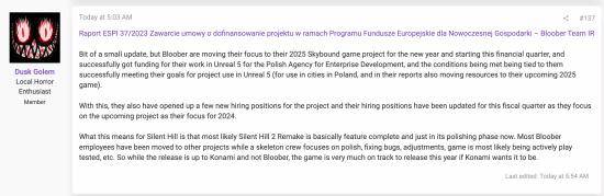 据知名爆料人Dusk Golem的说法,《寂静岭2:重制版》功能已基本完整,正处于打磨阶段。他还指出,Bloober Team网站1月2日的公司通知显示,他们的虚幻5相关项目已经拿到资金。这个项目就是和《行尸走肉》开发商合作的恐怖游戏。其中还提到,他们也将把资源转移到这个项目上。