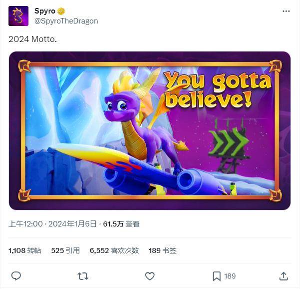 原标题:《小龙斯派罗》官方发2024座右铭推文 引粉丝玩家遐想