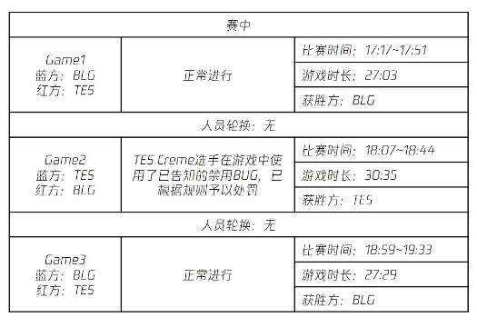 根据官方报告显示:“LPL春季赛揭幕战BLG对阵TES比赛的第二局,TES中单Creme在游戏中使用了已告知的禁用BUG,已根据规则予以处罚。”不过具体使用的BUG内容,公告中并未指出。