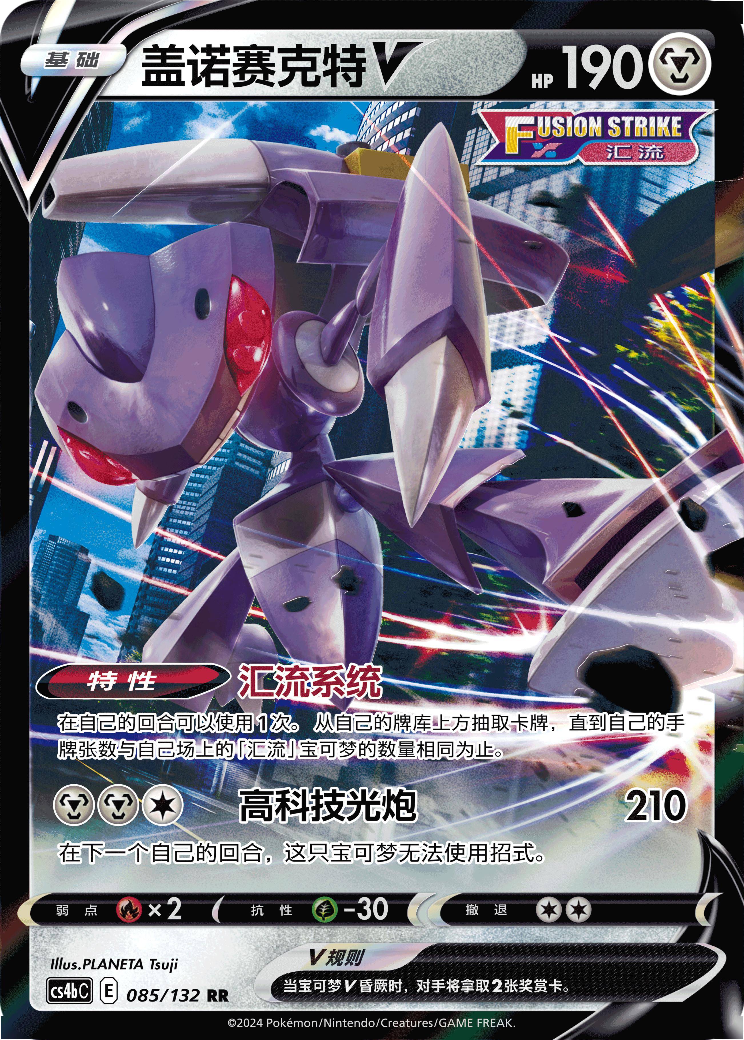 盖诺赛克特V的特性“汇流系统”顾名思义,仿佛就是为“汇流”卡牌而生。该特性每回合都可将手牌补充至与你场上的“汇流”宝可梦数相同的数量。有了盖诺赛克特V在场,你场上的“汇流”伙伴越多,你的手牌也将越多。集“汇流”之牵绊,你将所向披靡。