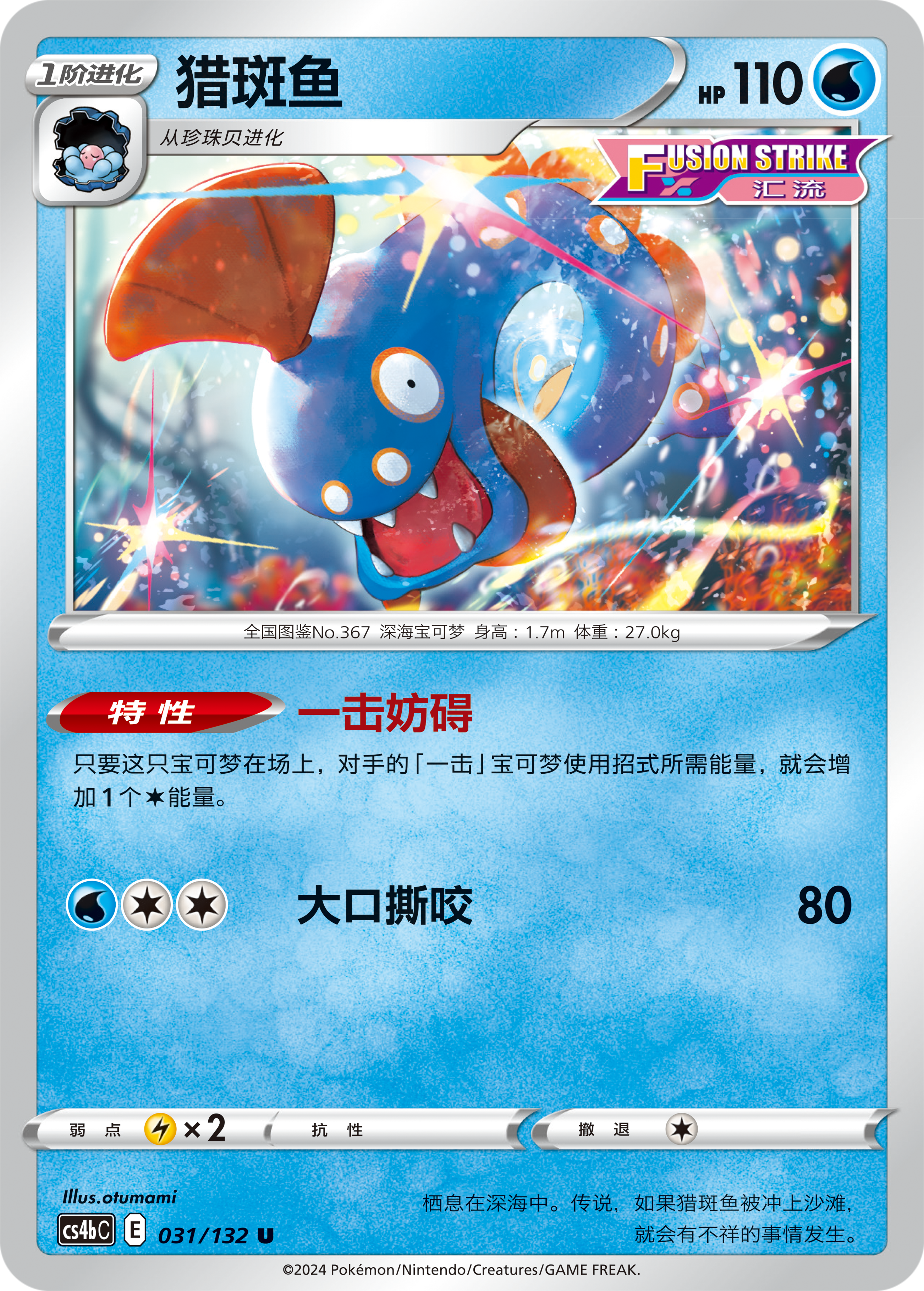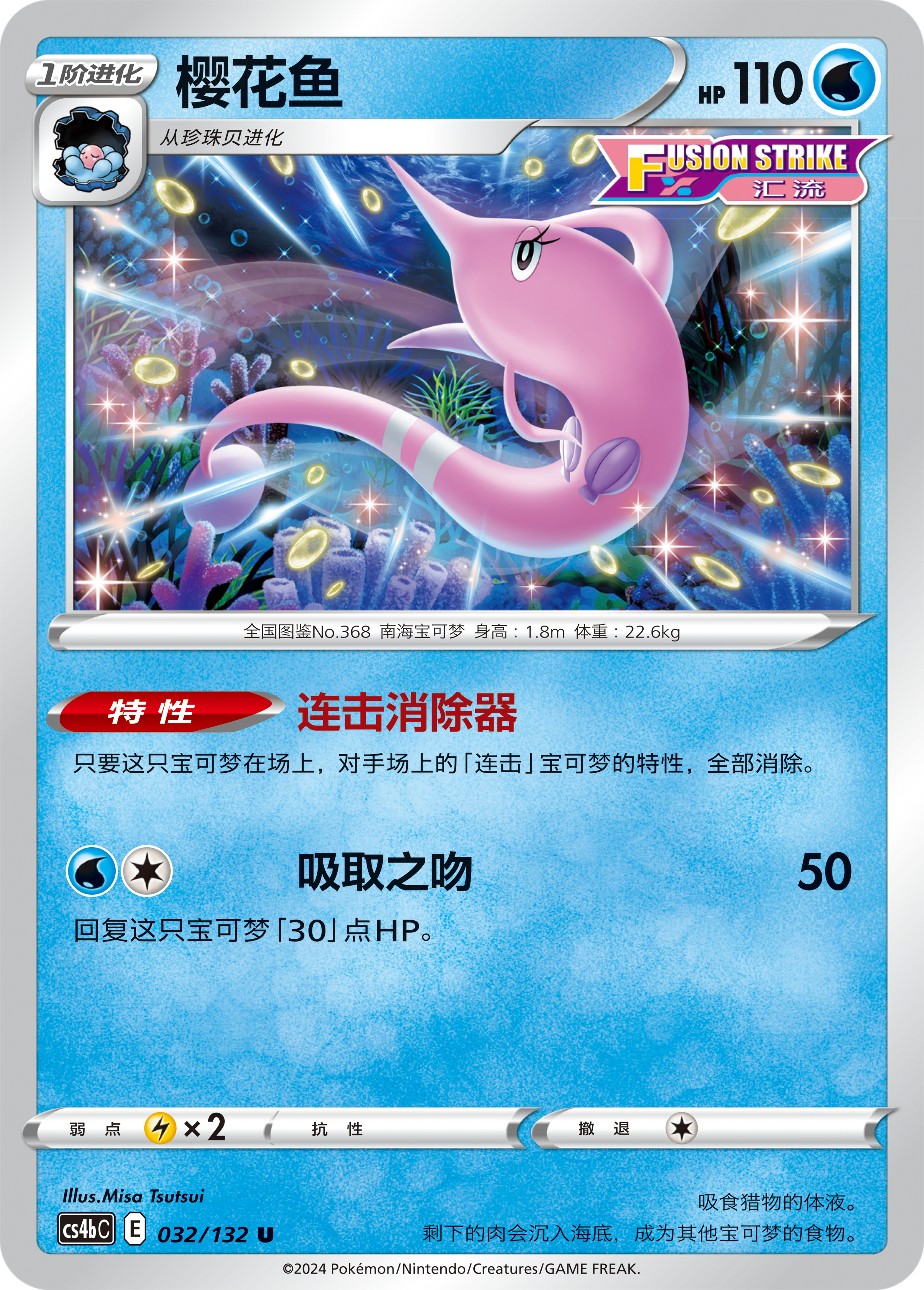 由珍珠贝进化而来的猎斑鱼和樱花鱼都能在对局中严重干扰对手,其中猎斑鱼的“一击妨碍”能让对手的“一击”宝可梦使用招式时需要多附加1个任意属性能量,让对手空有一身本领却无处施展;而樱花鱼的“连击消除器”则能消除对手“连击”宝可梦的特性,若在对手酣战之时成功进行封锁,其前期的精心准备都将功亏一篑。