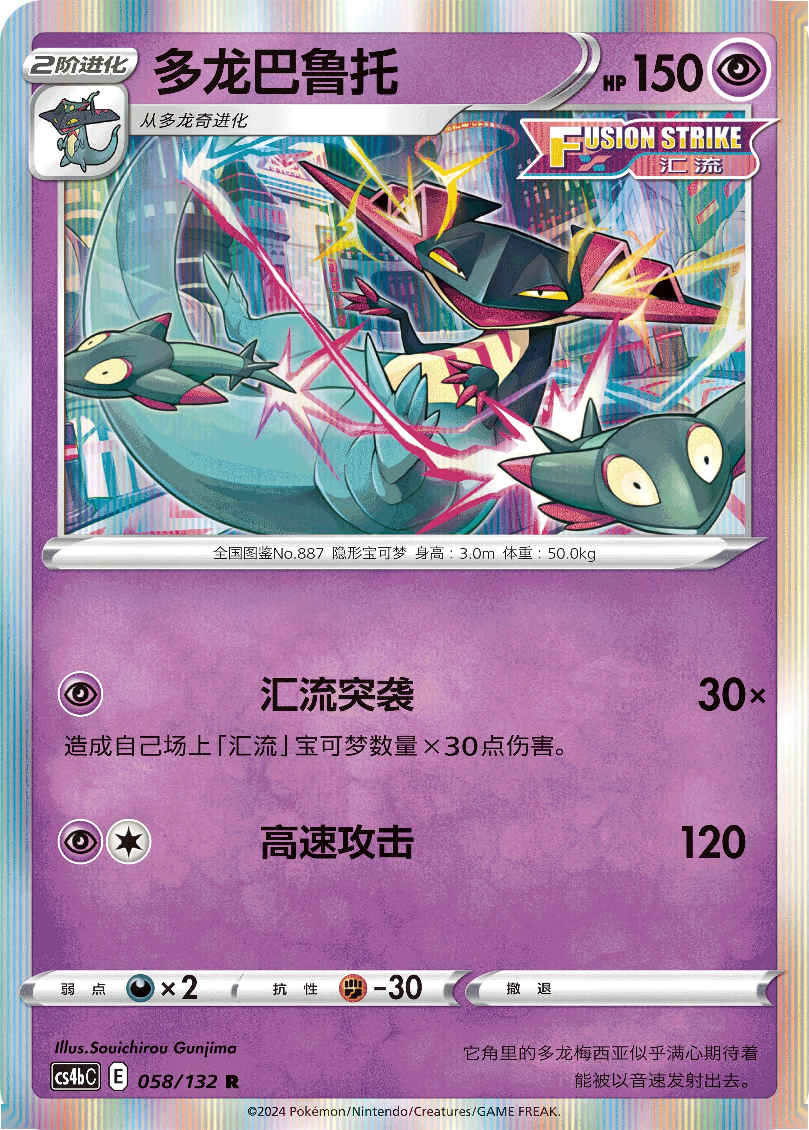 多龙巴鲁托的招式“汇流突袭”能根据己方场上“汇流”宝可梦的数量造成相应伤害,仅需1个超属性能量便能造成最高180点伤害,强力无比。