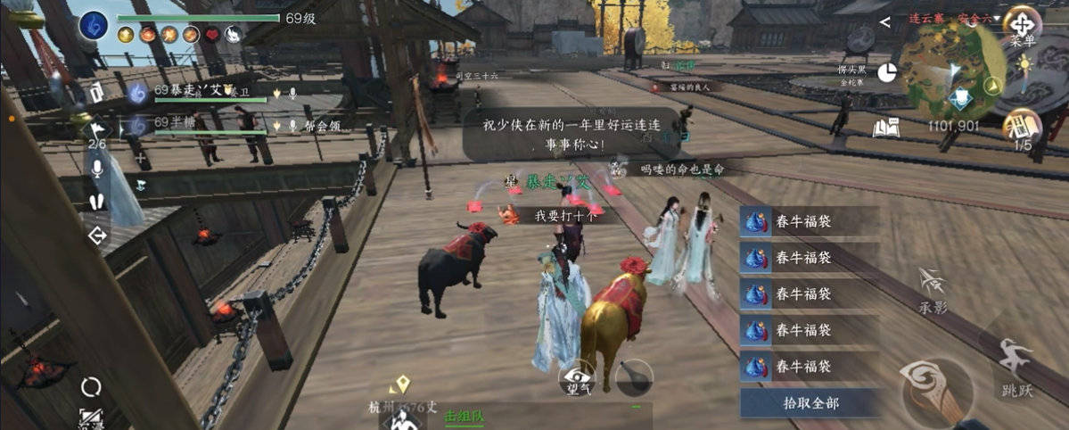 新春版本上线后,我们还可以体验千年前古人打春牛的习俗,在连云寨地图捡地上的鞭子去打春牛后,会掉落很多福袋,开启福袋还能获得大量交子,大家千万别忘了打春牛领福袋。