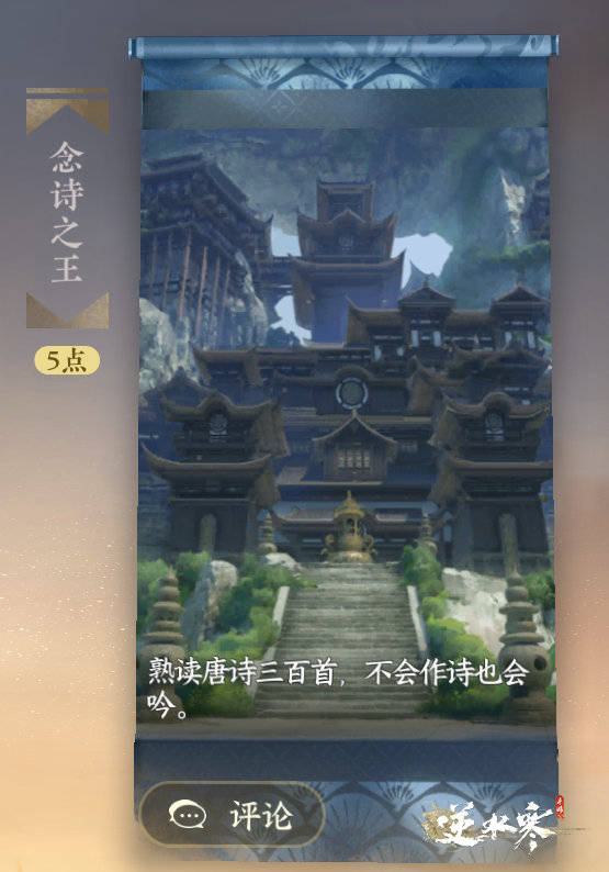 除了连云寨探索之外,新春版本的谪仙岛流派试炼也隐藏着趣味彩蛋。谪仙岛试炼是一个可玩性很高的副本,不仅可以铛铛铛弹反,还可以一直看帅哥,当我们完成李白的试炼后,悬崖边会有一坛万象皆春,喝四口后会出现成就“念诗之王”,瞬间就能体会到诗仙的浪漫豪情。