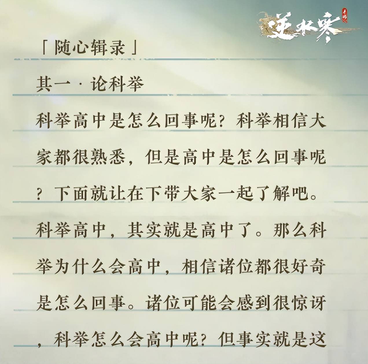 别忘了!《逆水寒》手游的江湖可谓是真正意义上的“人间真实”,古人也和如今的人们一样,会“中二”,会“网抑云”,也会“发疯文学”。且看几段话写出心路历程起起伏伏的短文,令人沉思;还有一位不知精神状况如何的学子,用一篇【随心辑录】化作北宋文坛中的泥石流横冲直撞!
