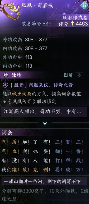 新春版本全新场景【连云寨】【摘星宫】正式上线!不知道你有没有去逛一圈呢?当我在【连云寨】里一边做着任务帮助当地百姓修水坝,一边探索大世界,欣赏着美丽的山间美景时,在某个隐藏场景中开到了一个极品戒指【凤凰·奇音戒】!本以为会是一个普通的独珍戒指,但在看到词条之!后!忍!不!住!唱!起!来!才发现原来是凤凰传奇联动的专属戒指!惊呆了!