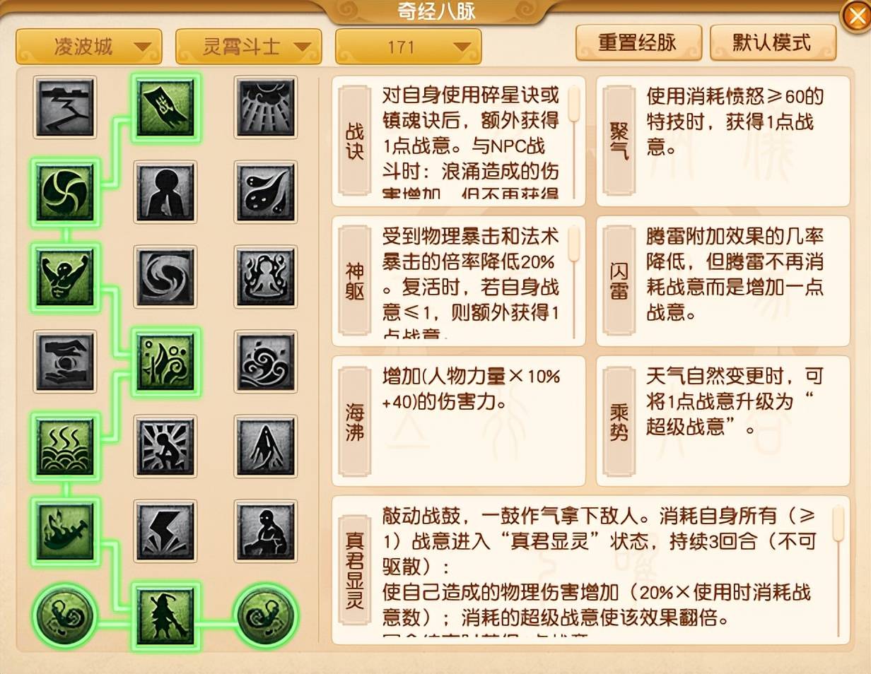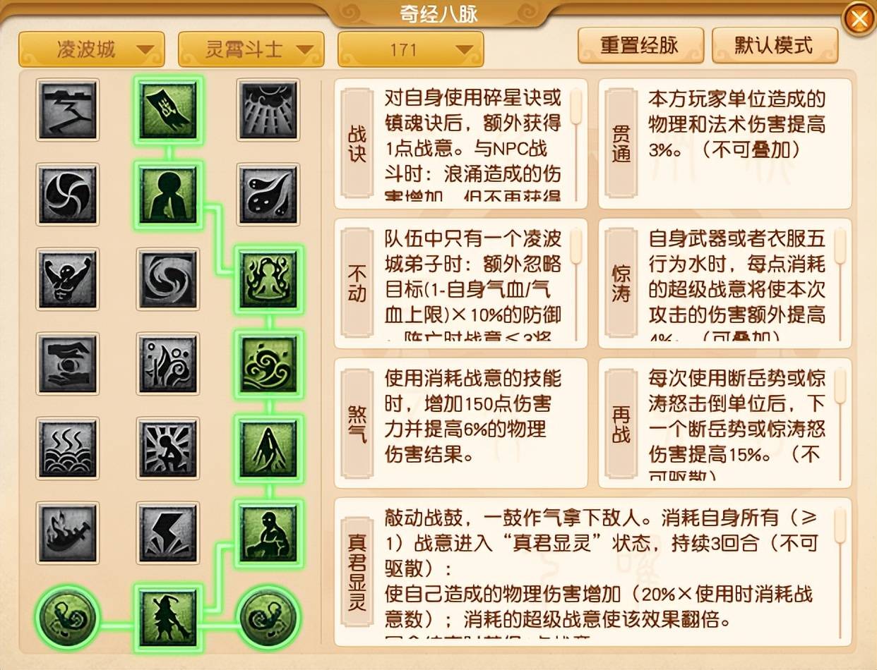 除此之外,【惊涛】经脉只有当你消耗超级战意的时候,增伤效果才会生效。这就意味着,如果你开场没有超级战意就开飞机,这个增伤是没用的。另外,【再战】是使用惊涛怒击倒单位后,才会起效。因此,想要玩好凌波城,一定要注意经脉的描述和说明,合理利用增伤机制才能打出爆炸伤害!