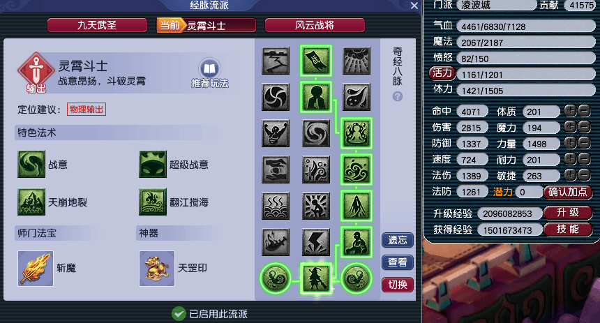 凌波城任务流派可以分为【九天武圣】和【灵霄斗士】,经脉点法差距不大。