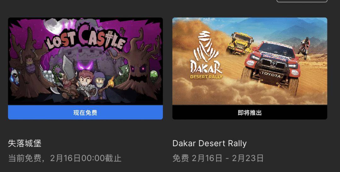 Epic喜加一现已更新,本周将免费两款游戏,分别是《心跳文学部Plus》和《失落城堡》,时间截止至2月16日零点,感兴趣的玩家不要错过了,下周送竞速游戏《达喀尔沙漠拉力赛》。