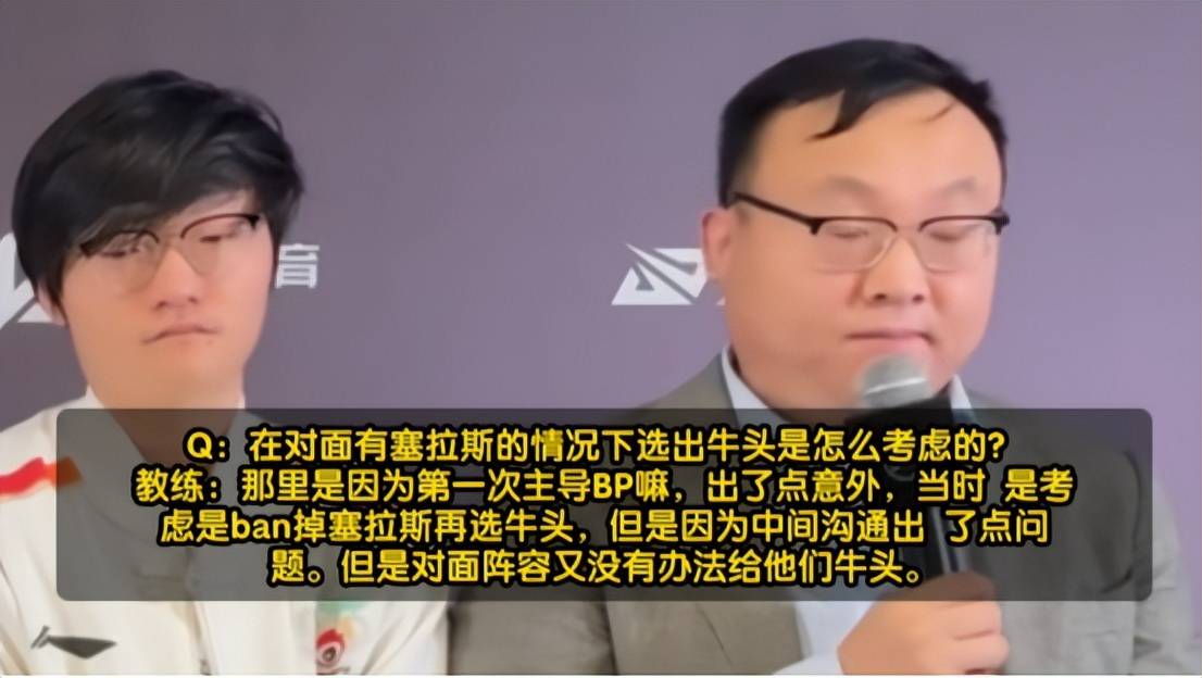 其实,最搞笑的还是WBG赛后采访环节,教练井盖疑似把顶着塞拉斯选牛头的锅甩到了选手上面,称之所以会有如此迷惑的BP,是因为中间沟通出了问题。但我们退一万步来说,这队内的辅助二哈出金身的行为,也不像是会玩牛头的啊,所以到底是谁要求选牛头的呢?