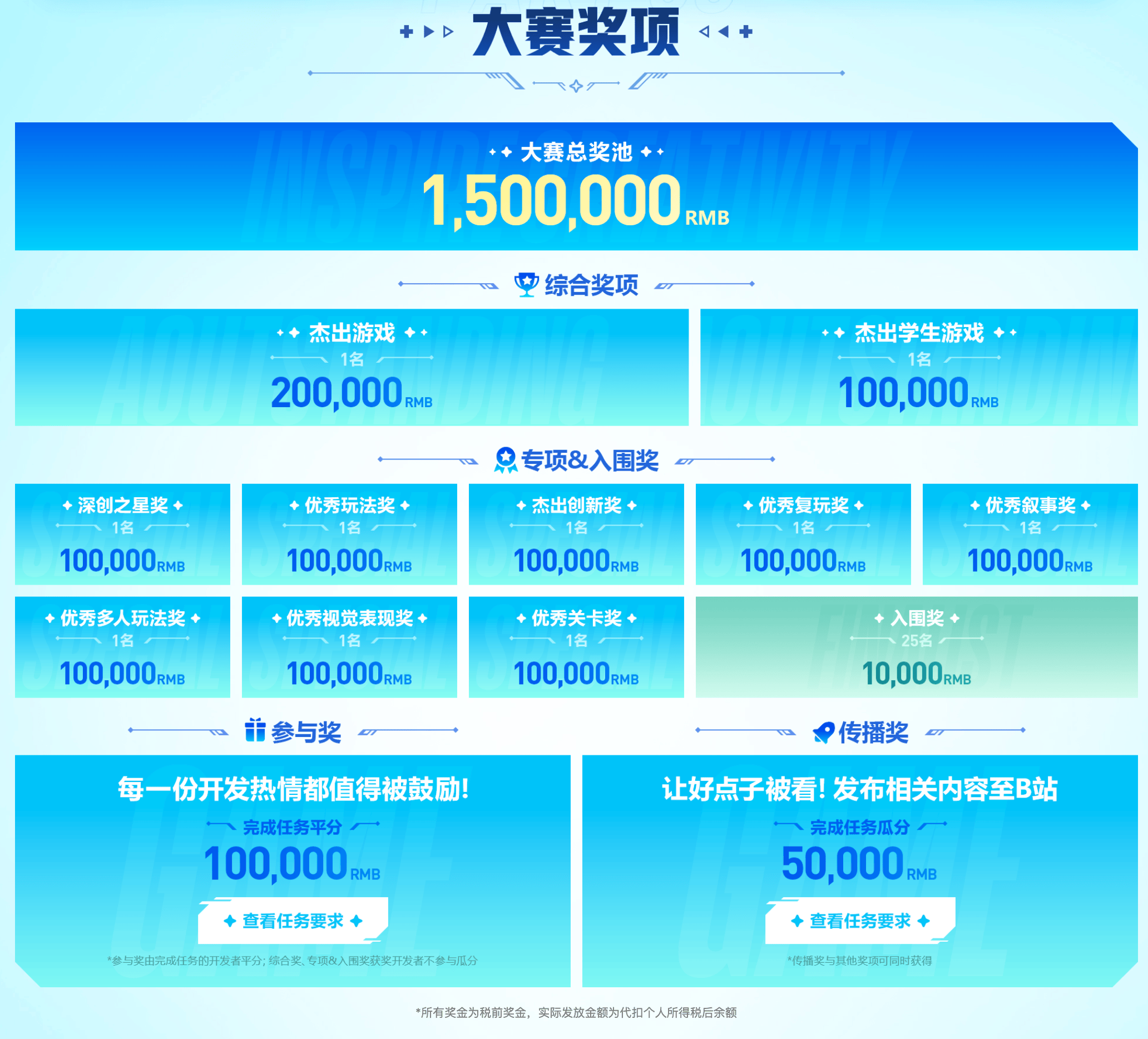 大赛报名门槛极低,无论是高校学生还是社会开发者,无论是个人还是团队,均可报名参赛。奖项类别多样,涵盖了玩法、美术、叙事、多人玩法、关卡设计等多个领域,鼓励开发者们充分展示自己的个性与创意。