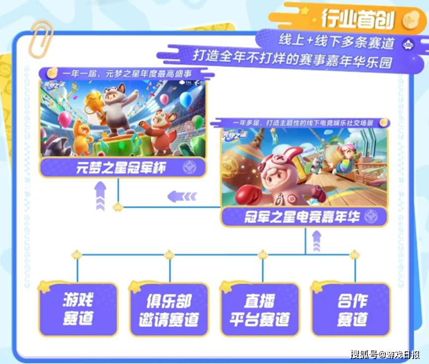 根据官方透露出的信息,“冠军之星锦标赛”由线上限时赛事和线下决赛暨电竞嘉年华两部分组成,其中线上部分包含四大赛道——游戏内赛道、俱乐部赛道、直播平台赛道、合作赛道,这个赛事全年会举办多届,每届的优胜者有机会参与年度最高电竞盛典“《元梦之星》冠军杯”。