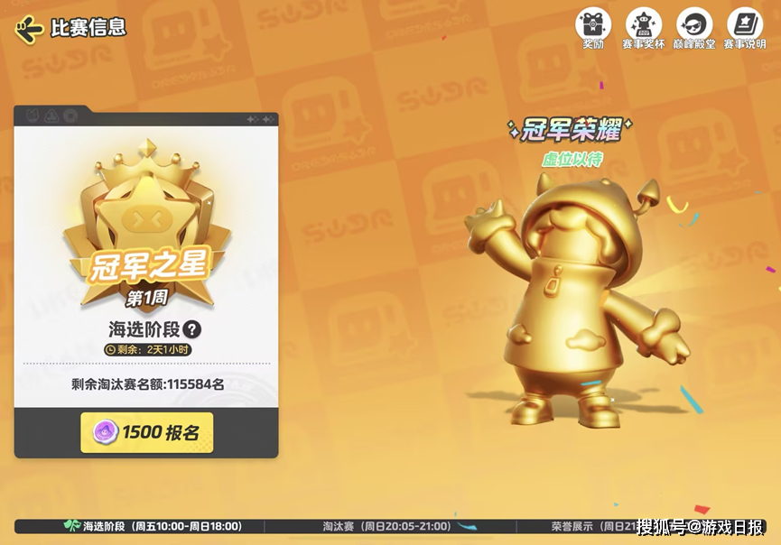 冠军之星锦标赛的报名入口放在主UI页面最显眼的位置,从具体规则来看并不是集中短暂的报名参赛期,首届线上比拼覆盖8周(每周后半周),在任何一周都可完成整个线上赛程,而且,它的筛选过程也不需要玩家刻意去打“不熟悉的内容”。