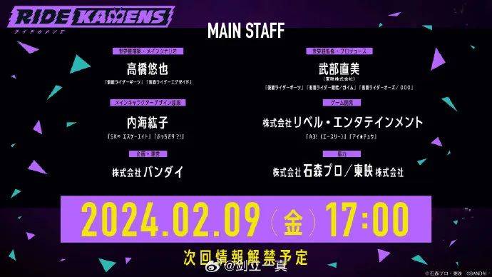 接着的话就是制作人员名单了,世界观架构和主剧本是由高桥负责,世界观检修和制作人是武部,角色设计原案是内海紘子。这个阵容也算是非常经典的了,虽然被很多粉丝诟病,但作为一对老搭档能够被派来负责这个新项目,足以见得官方对其的重视。假面骑士作为一个大IP,在手游这方面似乎并没有什么拿得出手的产品,看来这波官方应该押宝在这个上面了,还是非常值得期待的,你们认为呢?