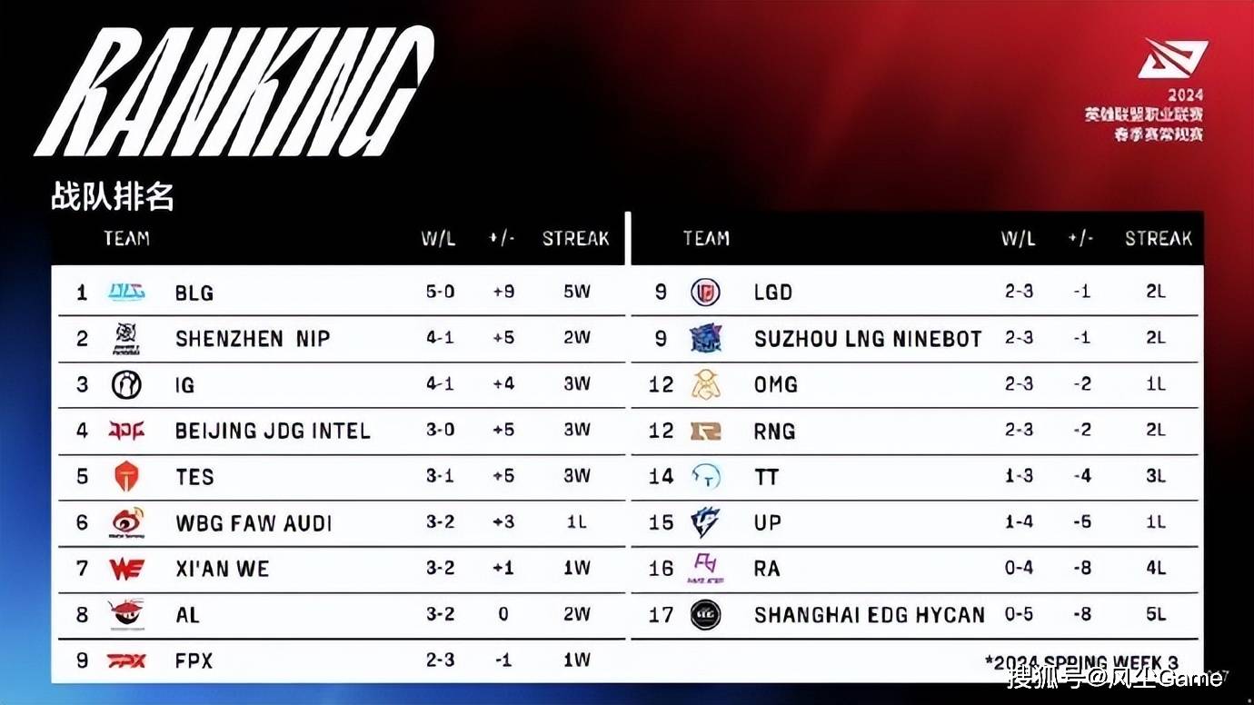 随着TES零封WBG,拿到春季赛第三胜,LPL春节前的比赛告一段落,现在的积分榜上,仅剩下了2支全胜战队,5-0的BLG、3-0的JDG,而除了BLG之外,积分榜前三的另外两支战队,让人感到比较诧异,因为NIP、IG,都算不上真正意义上的顶级强队,占了赛程优势。