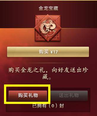 “金龙之礼”是一份包含祝福的“神龙之蛋”,收到礼物的玩家需要“孵化”一天,等待礼物解封。礼物解封后收礼的玩家即会获得一个金龙宝藏。