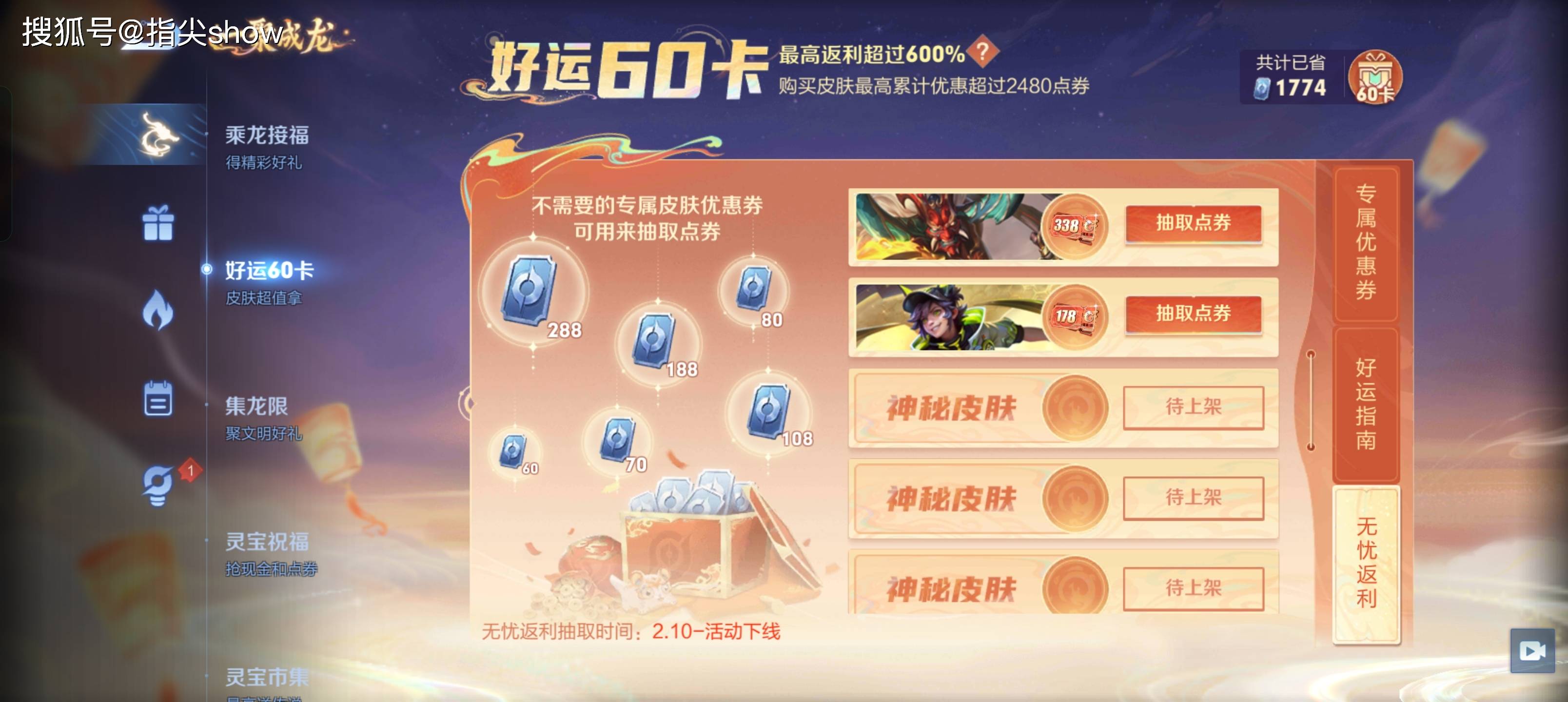 首先,60卡有保底,一共10款皮肤10张优惠券,每一张拿来抽奖都保底60点券,运气稍稍好一点那就能赚一些,丝毫没有压力。